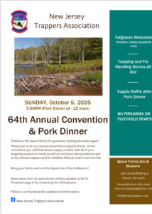 Come join us for our 64th annual convention and pork dinner at Space Farms Zoo & Museum, 218 county route 519 sussex nj 07461. Sunday October 5, 2025 , convention starts at 9:00 am and  Pork dinner will be at 12:00 noon. There will be demos from 9 till noon and all your trapping supplies will be available to purchase. This is also a great time to attend one of our meetings. Purchase your dinner reservation now before the convention at a reduced rate of $25.00